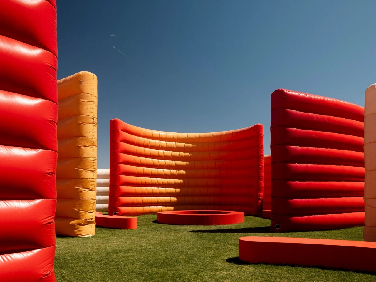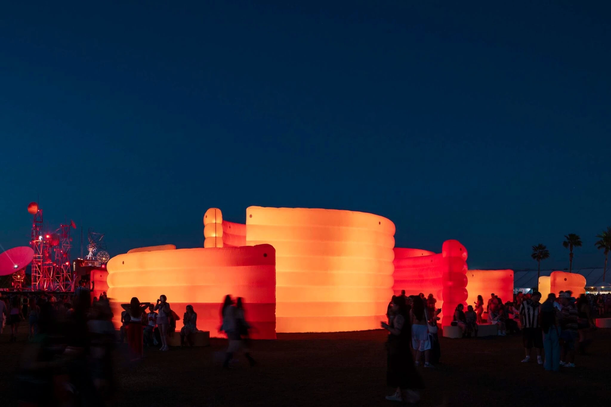 이 작품은 단순히 눈으로 보는 것에 그치지 않고 실제 쓰임새를 꼼꼼히 따져 설계했습니다. 공기를 넣어 팽팽하게 부풀린 벽면은 뜨거운 사막의 햇볕을 가릴 그늘을 만들고, 주변의 거센 음향을 부드럽게 가라앉혀 방문객에게 잠시 숨을 고를 자리를 내어줍니다.