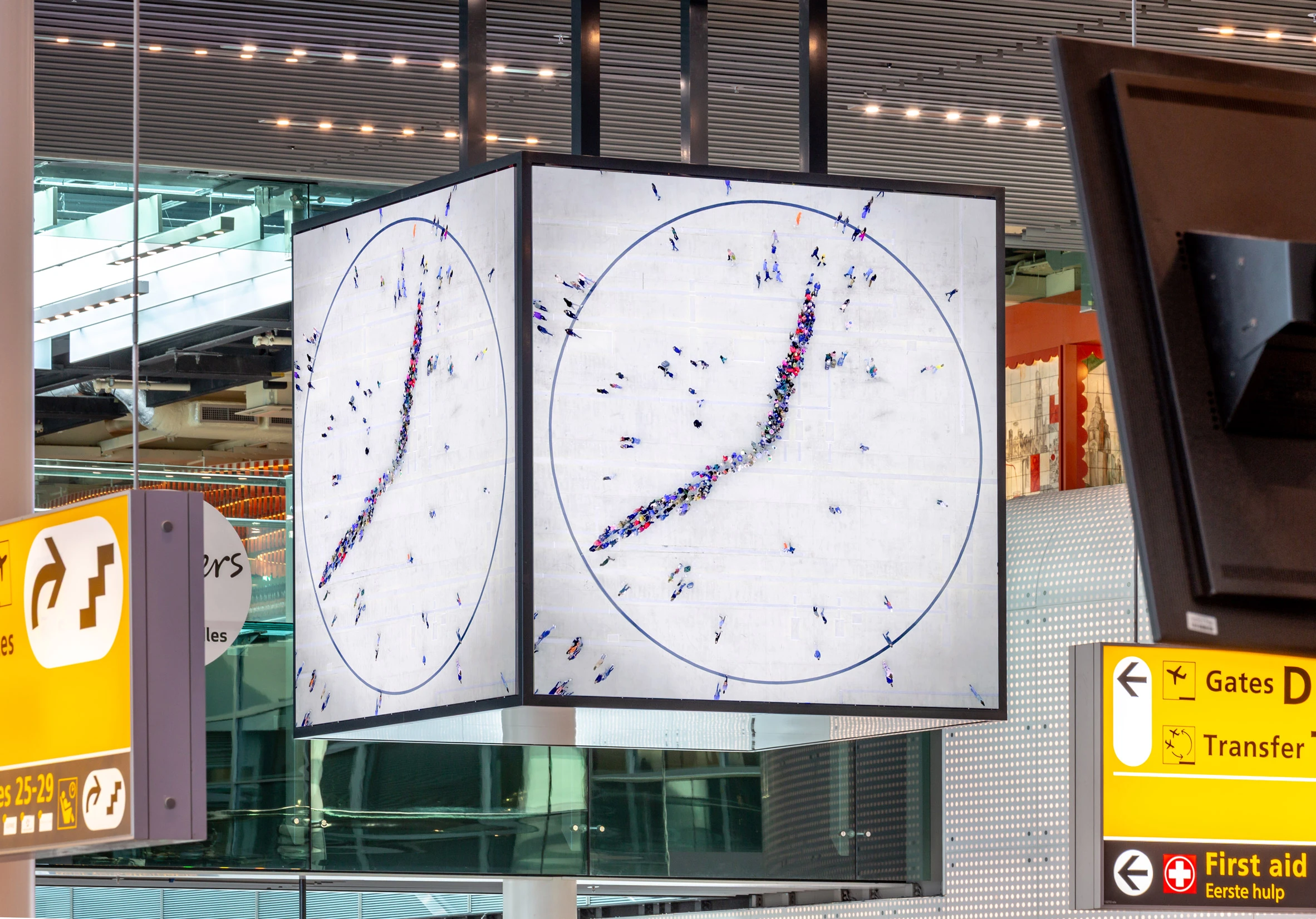 제작 과정에는 1,000명이 넘는 자원 참여자가 동원됐고, 청소 직원, 보안 요원, 객실 승무원, 사무 직원, 그라운드 핸들러 등 대부분 스히폴 공항에서 일하는 사람들로 구성됐습니다. 참여자들은 공항 격납고 내부에 마련된 촬영 세트에서 3일에 걸쳐 12시간 동안 대형을 이루며 시계 방향으로 작은 보폭을 옮기는 동작을 반복했고, 카메라는 머리 위에서 단일 오버헤드 컷으로 이를 기록했습니다.