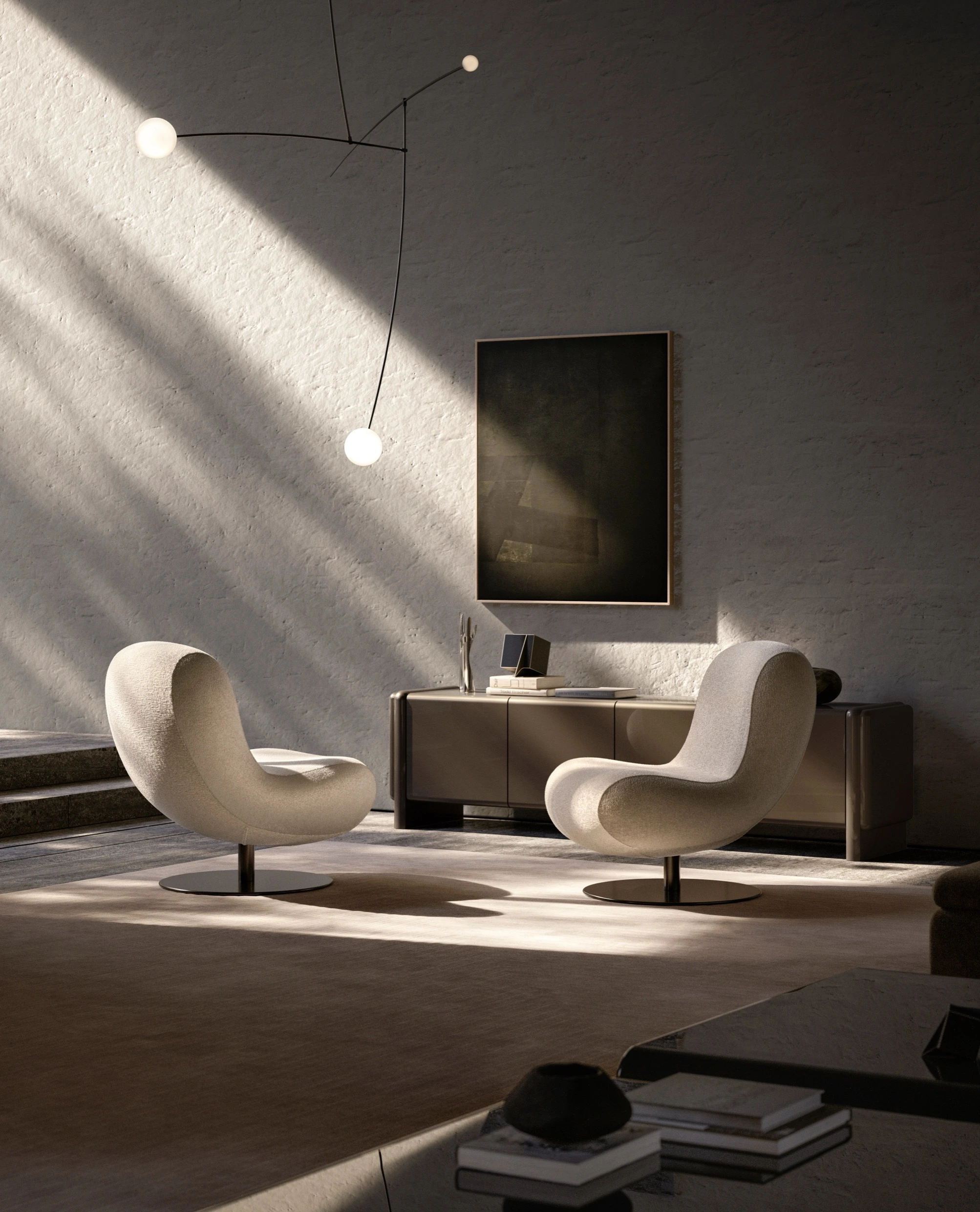 시각적인 안정감 역시 보스코의 큰 매력입니다. 전체적으로 컴팩트한 실루엣을 유지하면서도 사용자의 몸을 지탱하는 부분은 넉넉하게 설계되어, 공간 안에서 지나치게 튀지 않으면서도 묵직한 존재감을 드러냅니다. 불필요한 장식을 걷어내고 연속적인 곡선으로 완성된 형태는 공간에 안정감을 더하며, 어느 각도에서 보아도 편안한 시각적 휴식을 선사합니다.